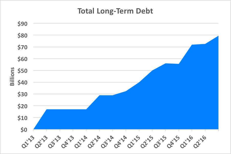 At the end of last quarter, Apple had $72.4 billion in total long-term debt (including current and non-current). It then sold $7 billion worth of paper at the end of July, bringing the total to nearly $80 billion. Note that this total does not include commercial paper, which Apple started selling in 2014. Apple currently has $12.5 billion of commercial paper outstanding in addition to long-term debt.
