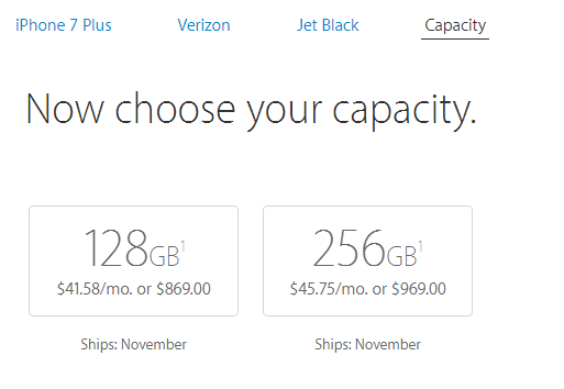 According to Apple's website, orders placed for the iPhone 7 Plus in jet black -- whether they're for the 128 gigabyte model or the 256 -- won't even ship to customers until sometime in November: