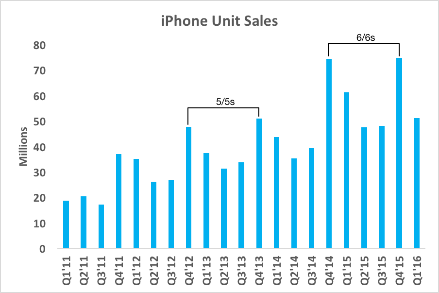 If you look back at the past couple of upgrade cycles, you'll notice that iPhone launches tend to perform in pairs due to Apple's "s" cycles. A redesigned new model is introduced, pushes unit sales to new highs, and the subsequent "s" cycle roughly matches it the following year. This makes sense considering the average user upgrades their phone every two years, and this two-year "s" cycle was timed perfectly to capture most users in alternating years.