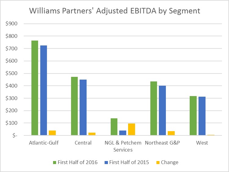 Overall, Williams Partners' adjusted EBITDA is up 10.3% over the same period last year while its distributable cash flow is up 12%. Driving that performance is Williams Partners' NGL and petchem services segment where adjusted EBITDA is up a stunning 234% to $137 million. Two factors drove this result, $72 million in favorable olefins margins at its Geismar plant and $30 million of incremental fee-based revenues associated with its interest in the Canadian off-gas processing plant at Canadian Natural Resources' upgrader.