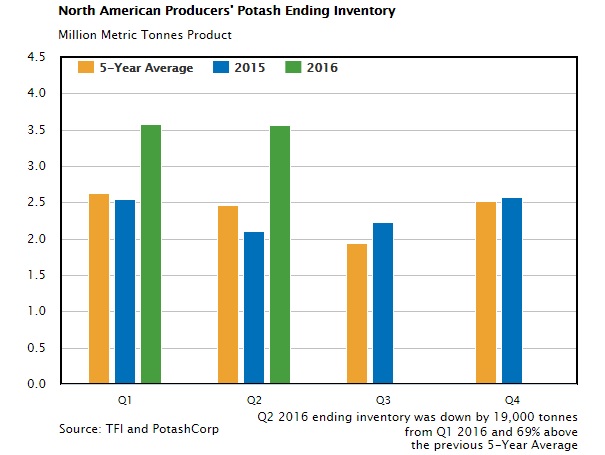 Inventory in the second quarter was almost 69% above the five-year average. Things could get tougher if new supply continues to hit the market, though PotashCorp isn't too worried about the supply side.