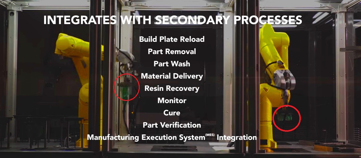 Robotic arms lifting 3D-printed objects (circled in red) from vats. Image source: 3D Systems.