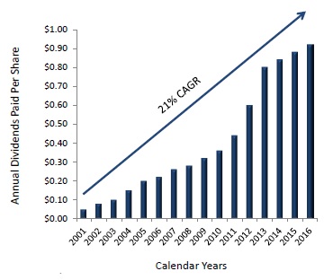 If that performance gap blew your mind away, you'd be surprised to know that Royal Gold has increased its dividend every year for 14 straight years, without flinching even during the commodities bubble. Royal Gold has grown its dividend at a compounded rate of 21% since 2001.