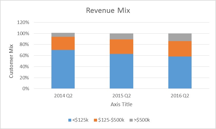 Some of this maturing customer mix can be attributed to organic growth of Square's existing vendor pool. When those who use Square's products grow their business, it's good for that business and good for Square. Some growth can also be attributed to acquiring new customers with higher annual GPV. Though the customer mix is improving, growth has been slow. As the graph above demonstrates, last quarter the company grew the $125K-$500K segment by 2 percentage points (from 26% in Q2 2015, to 28% in Q2 2016) and the over $500,000 segment by 3 percentage points (from 11% in Q2 2015, to 14% in Q2 2016).