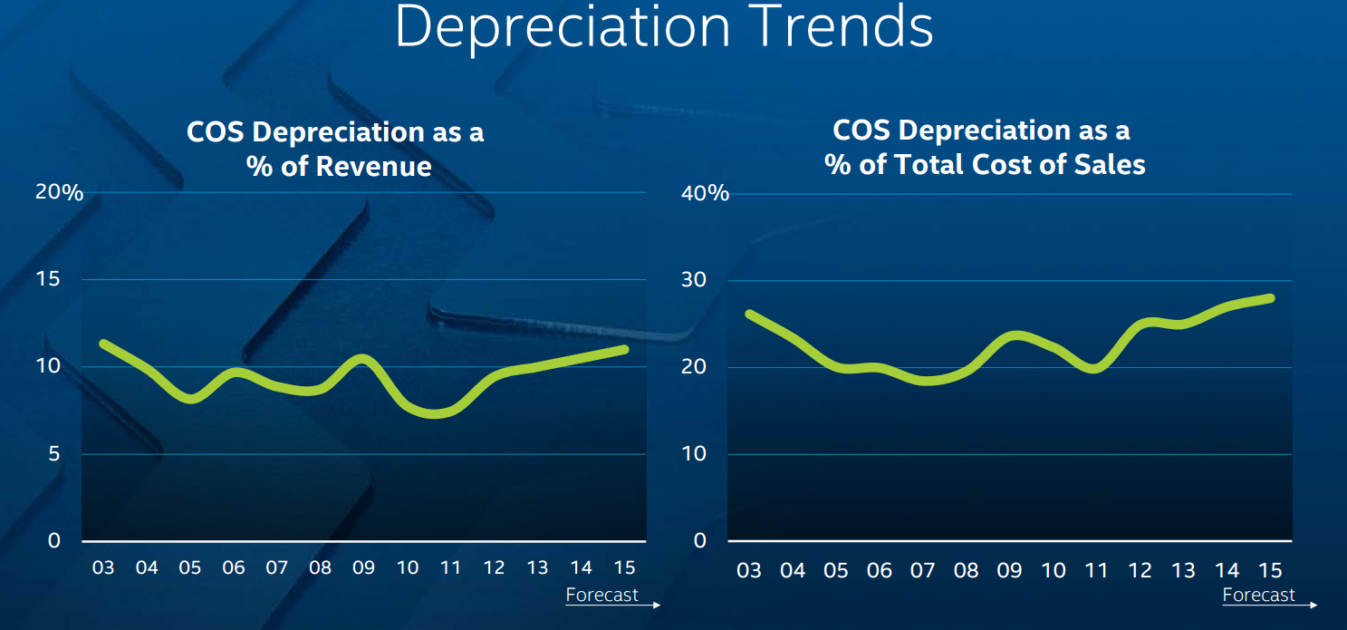 The depreciation costs that Intel incurs in a given quarter are essentially fixed, and that cost is spread out across the number of chips that the company ships in a given quarter. They're also a significant portion of Intel's total cost of sales, as the slide below illustrates: