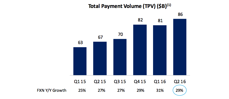 PayPal registered $86.2 in TPV during the second quarter of 2016, growing 28% year over year in U.S. dollars and increasing 29% in constant currencies. Payment volume at PayPal's social payment platform, Venmo, grew 141% to $3.9 billion.