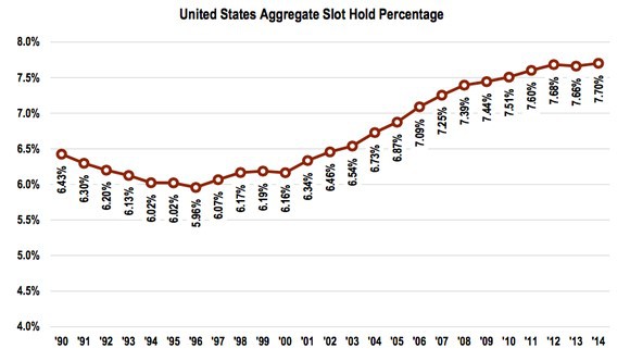 As I noted last year, the house advantage has been on the rise for two decades, such that its higher than ever before. The chart below from the Association of Gaming Equipment Manufacturers (AGEM) details the aggregate slot hold percentage for slot machines across 16 states (effectively the U.S. commercial gaming industry plus Connecticut), which rose steadily from 5.96% 1996 to 7.70% in 2014. That represents the actual percentage of every dollar wagered on slots that casinos earned as slot revenue.