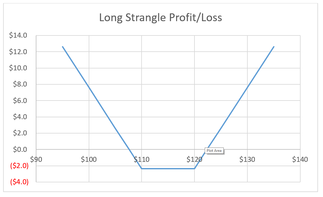 In a long strangle, your losses are capped at the cost of the options contracts, while your profit potential is unlimited and depends on just how far the stock moves.