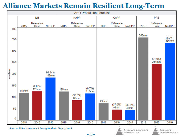 For starters, Alliance operates predominantly in the Illinois Basin (ILB), one of the most desirable coal regions in the United States. In fact, according to the U.S. Energy Information Administration, the ILB is the only coal basin expected to see modest increased demand in its baseline estimates out through 2040. There will be robust growth, however, if currently proposed power regulations aren't implemented. In fact, over the next 15 years or so, coal is expected to supply at least 20% of U.S. power in the absolute worst-case scenario envisioned by the EIA.