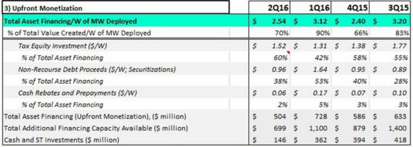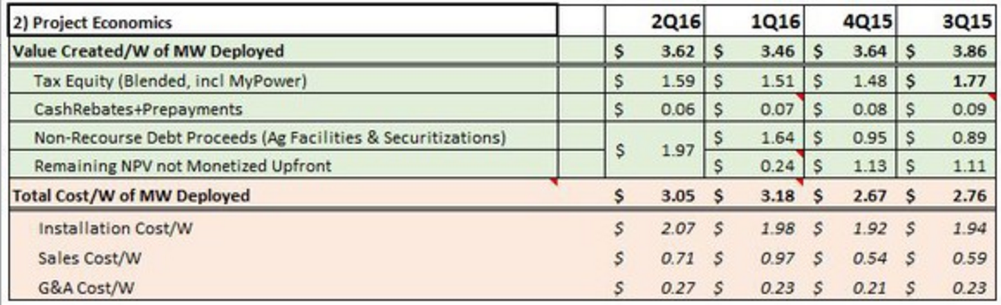 Even with the financing risks, the company has done a pretty good job so far in creating value for shareholders. SolarCity's projects last quarter created a net present value of $3.62 per watt deployed, compared to all-in costs of $3.05 per watt deployed. Multiplying the spread between the two ($0.57/W) by the total capacity deployed (199 MW, excluding cash sales) means the company created more than $100 million of value to equity holders from their energy contracts during the quarter.