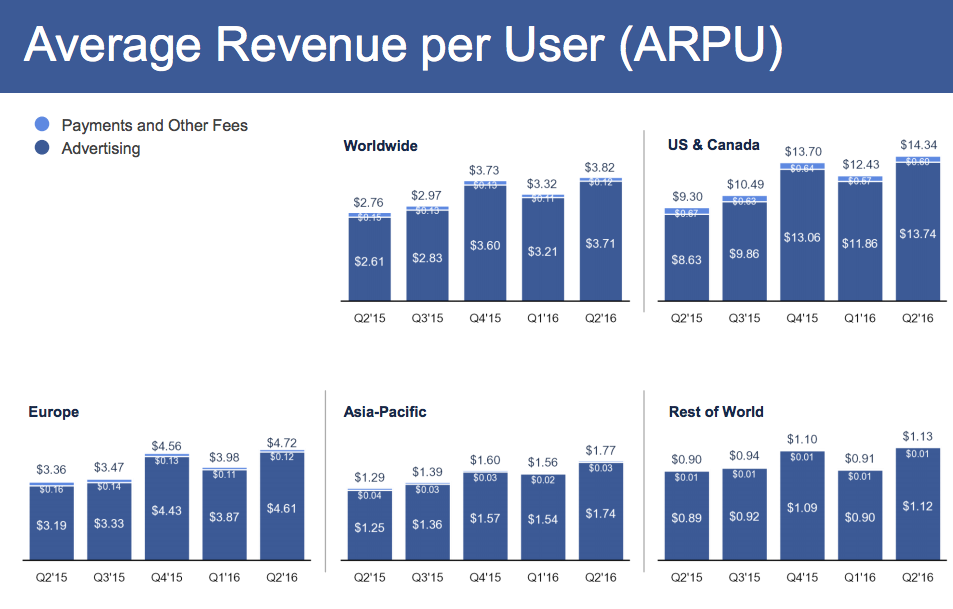 Average revenue per user reached $3.82 in the second quarter of 2016, an increase of 38% versus the second quarter in 2015. Importantly, revenue per user in the U.S. and Canada is much higher, at $14.34. This means that Facebook still has considerable room to increase revenue per user on a global scale, if the company can bring monetization levels across the world to levels more in line with those of the U.S. and Canada.