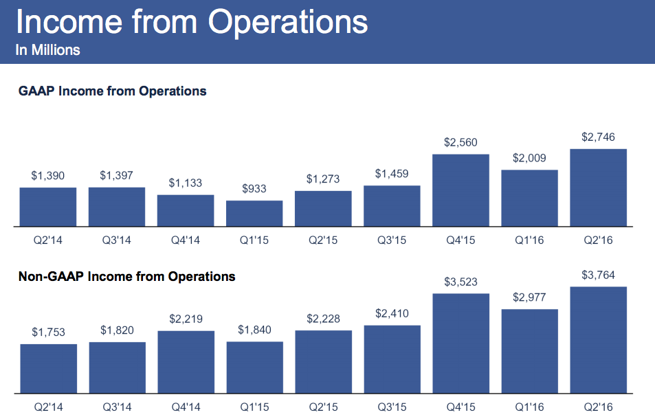 However, revenue is still outgrowing expenses, so profit margins are moving in the right direction. Operating profit margin grew from 31% of sales in the second quarter of 2015 to 43% of revenue. Income from operations more than doubled year over year, from $1.27 billion in the second quarter of 2015 to $2.75 billion in the second quarter of 2016.