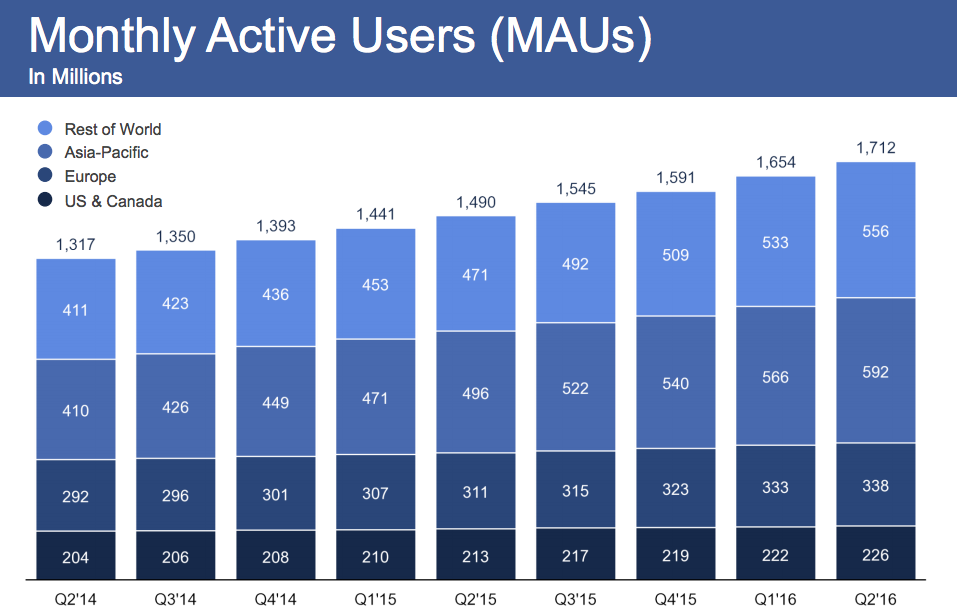 Users are the lifeblood of the business, as Facebook needs to have a vibrant and engaged user community in order to produce sustained growth in revenue and earnings. Fortunately for investors in the company, Facebook is doing quite well in this area. The company ended the second quarter of 2016 with 1.71 billion monthly active users, an increase of 15% versus the same period in the prior year.