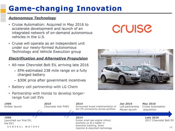 It's leveraging its two-decade-old OnStar service to position itself as a leader in vehicle connectivity, while making substantial, credible moves into autonomous-driving technology, electric vehicles, and ride-hailing and car sharing services.