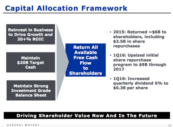 GM executives are focused on delivering results to shareholders. The "capital allocation framework" that GM announced last year emphasizes reinvesting profits in opportunities that offer a likelihood of high returns, maintaining an investment-grade balance sheet and a strong cash reserve, and returning all excess free cash flow to shareholders.
