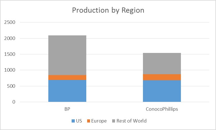 As that chart shows, both companies have significant geographical diversification, though BP does produce more oil and gas outside the U.S. Meanwhile, both produce a balance of oil and gas with liquids accounting for 53% of BP's production and 58% of ConocoPhillips.