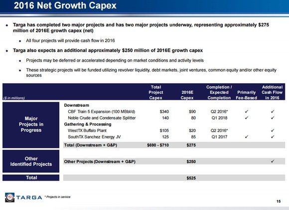 As the below slide shows, Targa Resources expects to invest up to $525 million this year on growth capex: