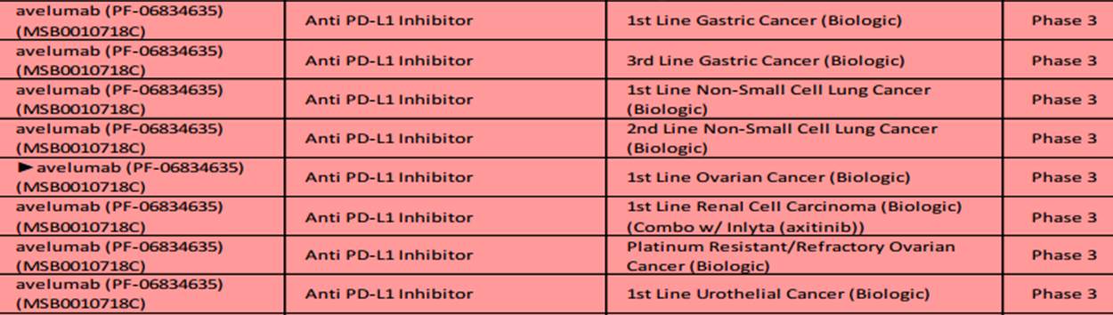 Image source: Pfizer. List of avelumab's current slate of late-stage clinical trials.
