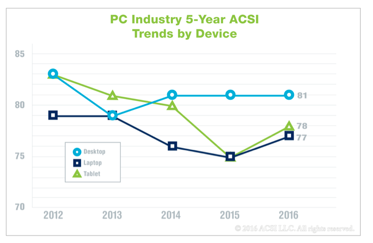 Desktop computers continue to rank the highest on the ACSI survey, which uses a 100-point scale, remaining unchanged from last year at 81, while tablets and laptops have improved for the first time in four years. Tablets climbed 4% to a score of 78, inching ahead of laptops, which gained 3% to 77.
