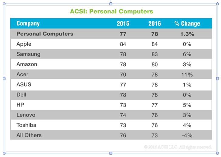 "In an increasingly mobile world, smartphones are the biggest threat to PC sales, and tablets have not been the long-term panacea the PC industry was hoping for," said ACSI Chairman Claes Fornell in a press release.