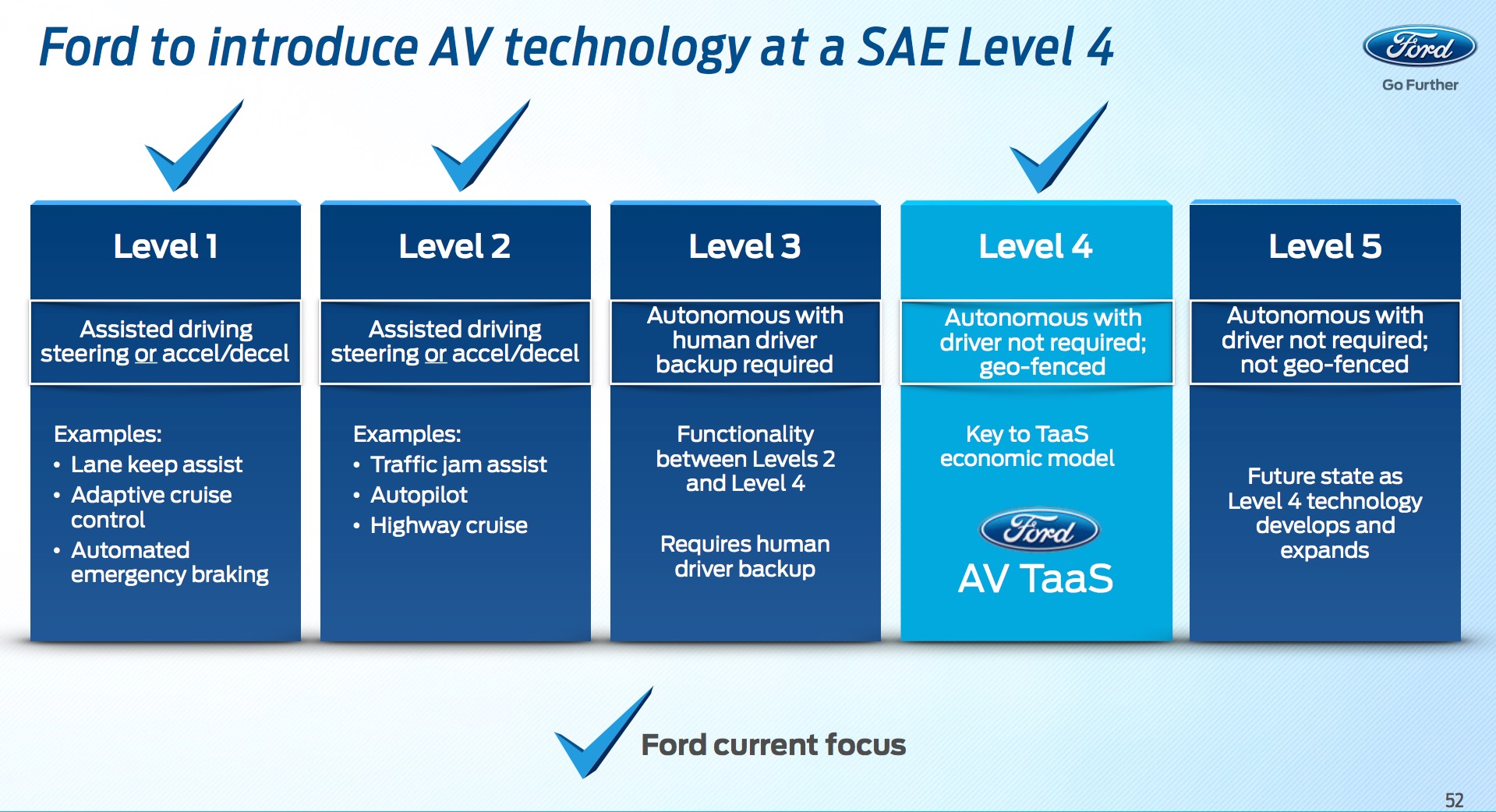 The levels that Nair is referring to are stages of vehicle automation as defined by the Society of Automotive Engineers (SAE). Here's Ford's summary.