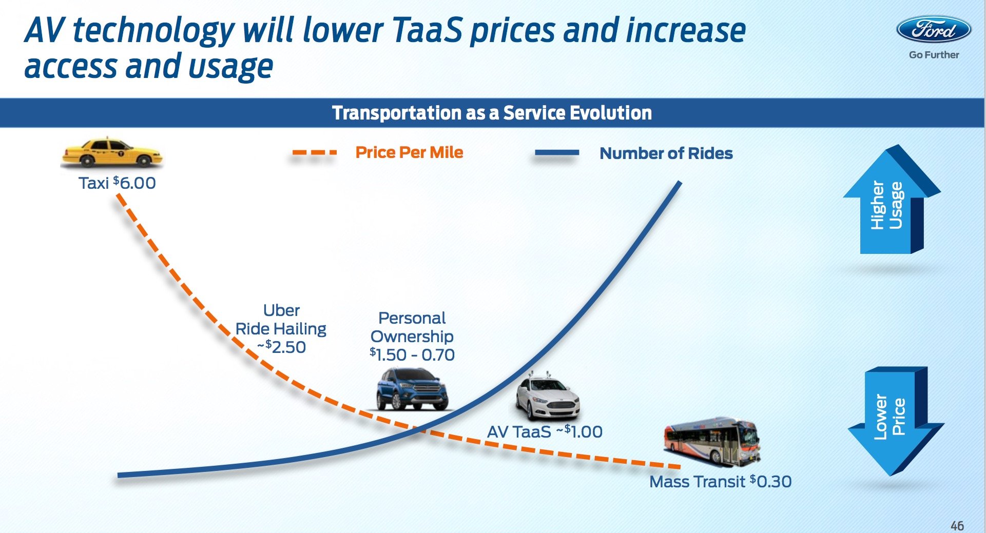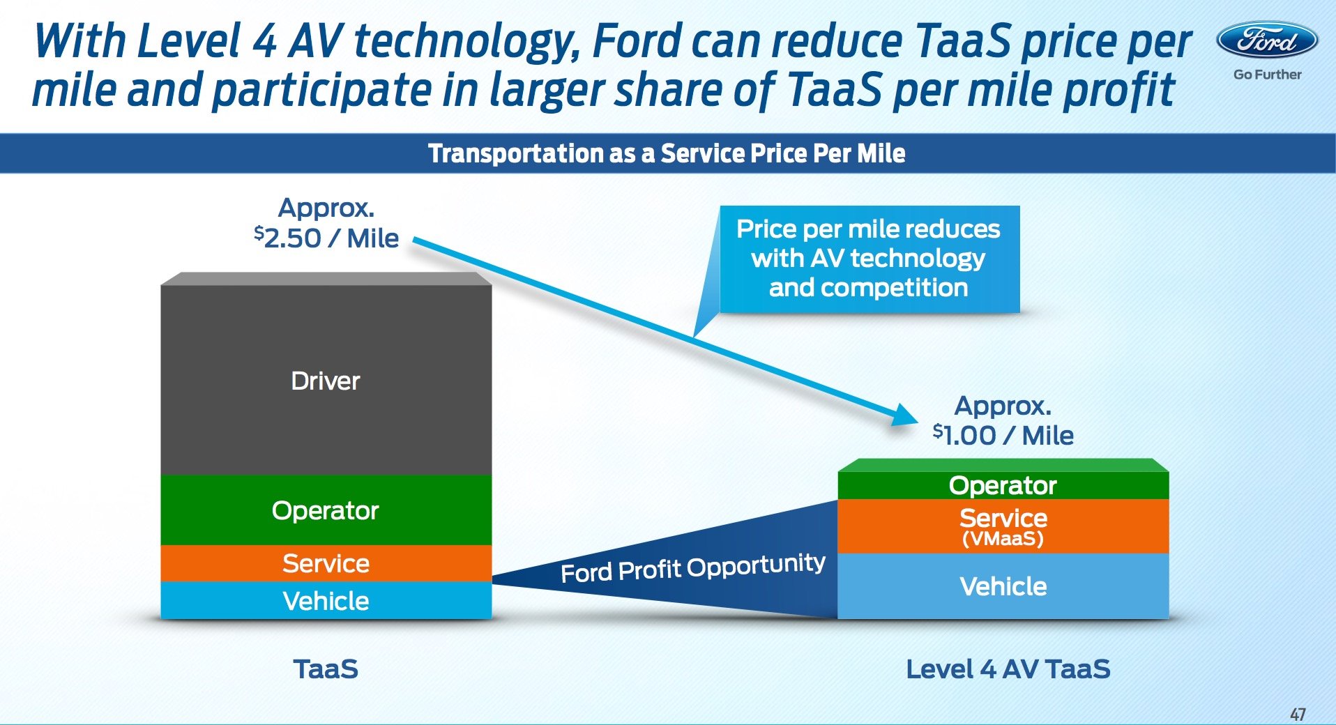 As Nair explained, the biggest contributor to costs in a ride-hailing service is the need to pay the (human) driver. When that goes away, the costs drop significantly -- below the $0.70 to $1.50 per mile that Ford estimates is the average cost of owning a car.