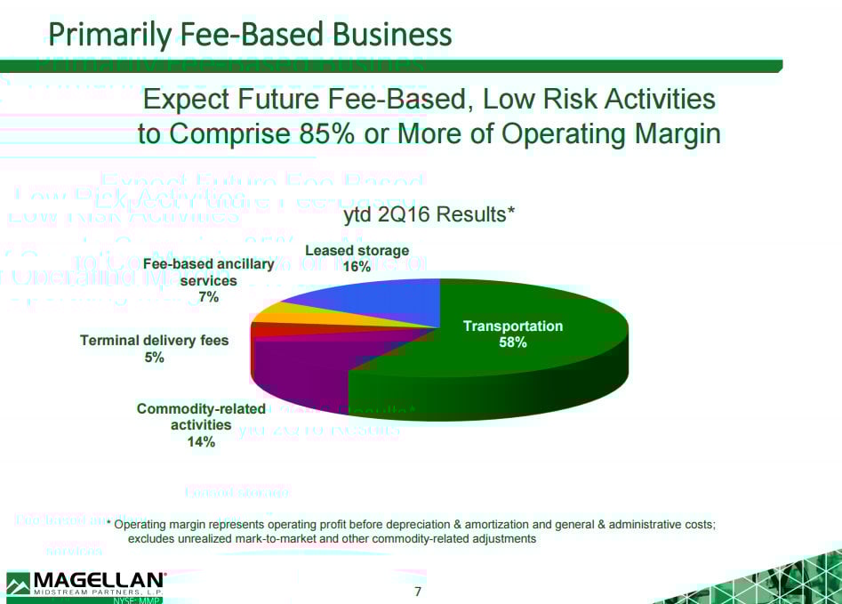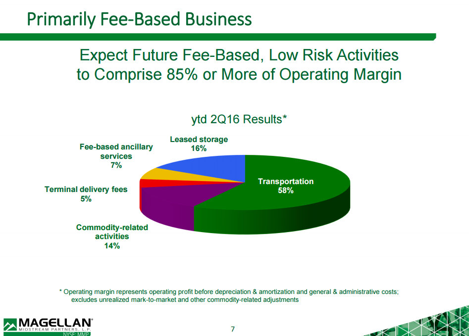 Magellan Midstream Partners, likewise, is primarily focused on fee-based assets, though refined products and crude oil pipelines and services supply most of its operating margin: