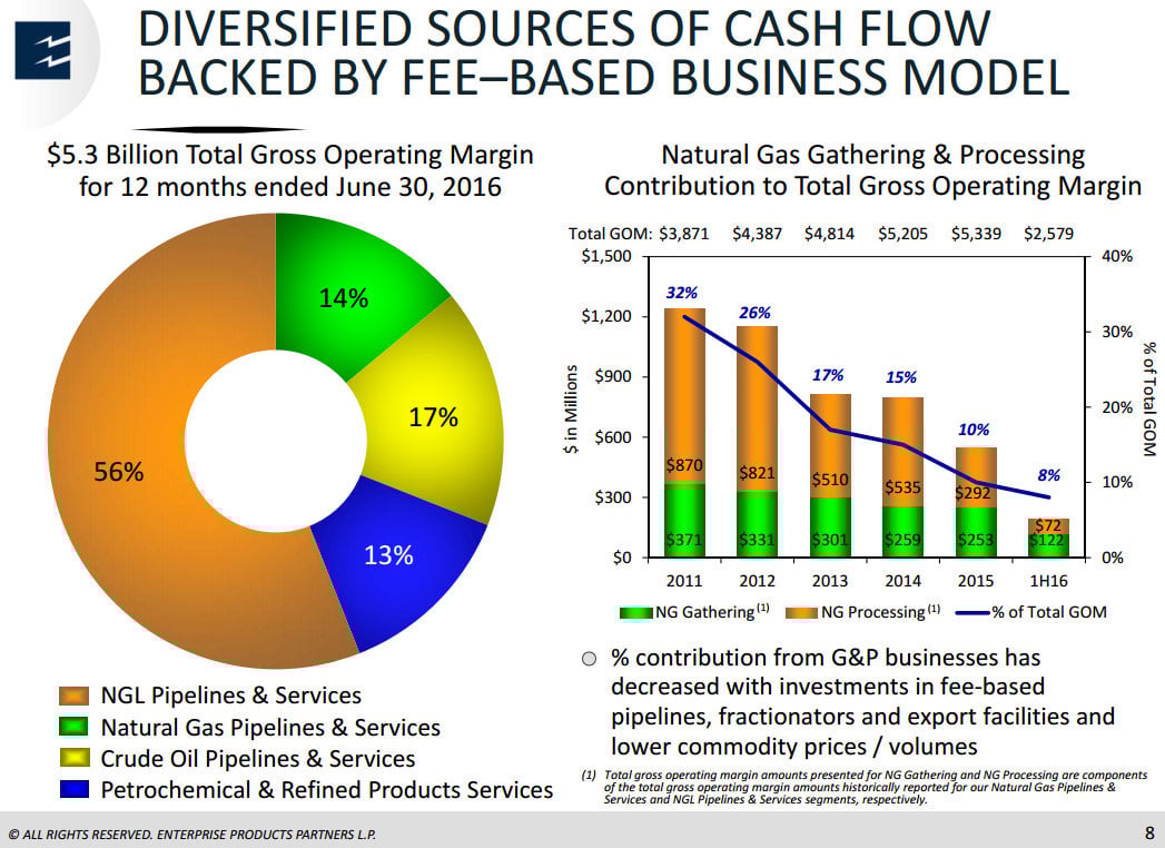 While the bulk of Enterprise Products Partners' gross margin comes from its NGL pipeline and services segment, the company's assets consist of fee-based pipelines, processing plants, and export facilities across the oil and gas value chain. That focus on fees is crucial because the company's direct exposure to volatile commodity prices is less than 15% of its gross operating margin, which is a significant shift from five years ago. That enabled the company to deliver relatively stable cash flow during the current oil market downturn.
