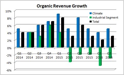Ingersoll-Rand has an opportunity to expand operating margin with its Trane brand (air conditioning systems), and management has delivered so far this year. Having started the year expecting 3% to 5% organic revenue growth and operating margin of 13.25% to 13.75%, the climate segment is now forecast to hit 4% to 5% organic revenue growth with a 14% to 14.5% operating margin.