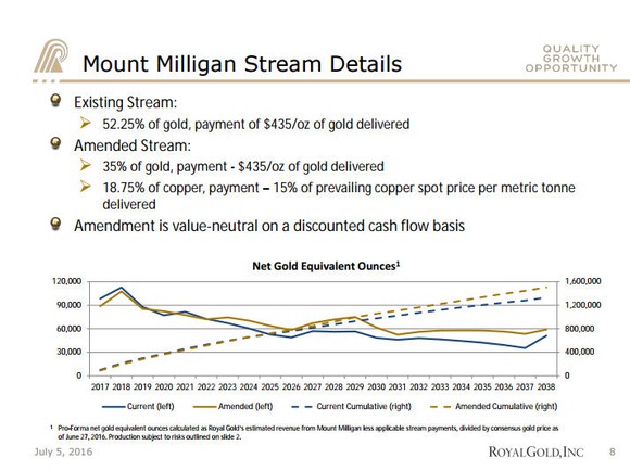 The big change that made all of this happen was Royal Gold's being willing to drop its 52.25% gold streaming interest at Mount Milligan to 35%. In exchange, it will get an 18.75% copper stream. Royal Gold's gold costs will remain $435 per ounce of gold, and it will pay 15% of the spot price per metric tonne of copper. The expected impact for Royal Gold should be a wash over the long term.