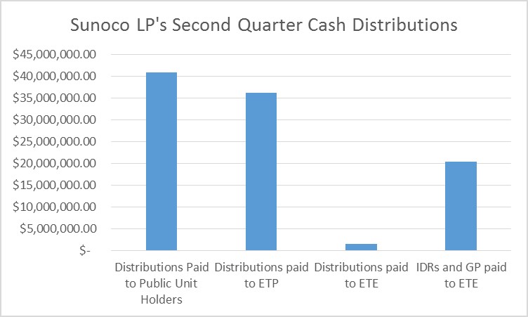 As this chart shows, despite the fact that Energy Transfer Equity only owns 2% of Sunoco LP's outstanding units, it received 22% of last quarter's cash distributions because the IDRs give it an increasing share of the company's distributable cash flow.