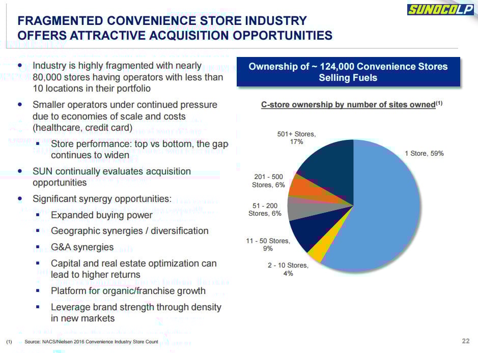 Meanwhile, it continues to make acquisitions in both the retail and wholesale distribution segment. Last quarter, for example, the company agreed to purchase the fuels business of Emerge Energy Services (NYSE: EMES) for $178.5 million. The Emerge Energy Services' deal diversified the company by adding transmix operations and other midstream assets to the mix, providing additional platforms for future growth. In addition to that, Sunoco agreed to buy the convenience store, wholesale motor fuel distribution, and commercial fuels distribution businesses from Denny Oil Company. That deal continued the company's roll-up strategy, whereby it has acquired more than $500 million of third-party retail and wholesale fuel distribution assets since Dec. 2014. It has plenty of additional roll-up opportunities given the fragmentation in the industry as the chart on the slide below shows: