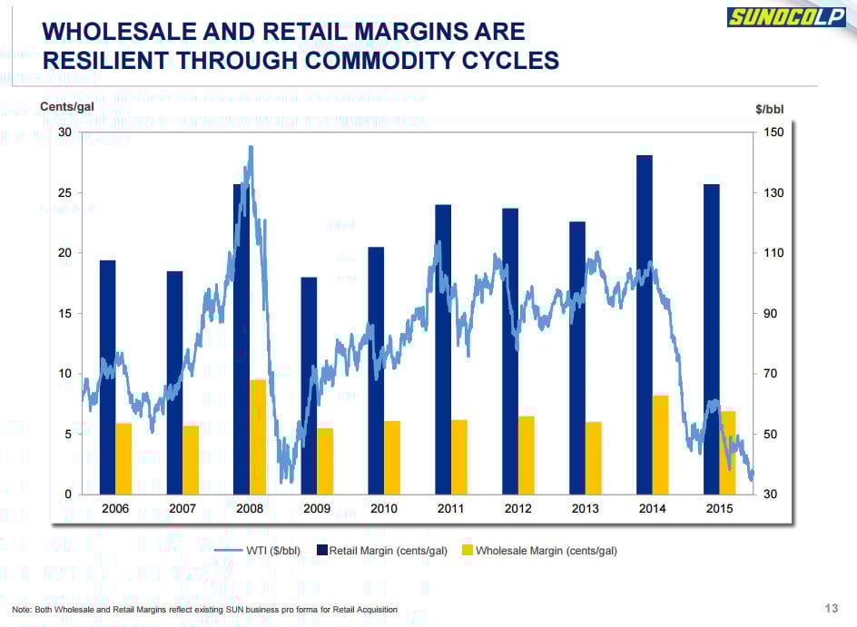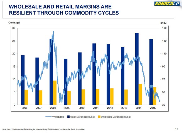 While most MLPs own fee-based assets like pipelines and processing plants, Sunoco LP owns gas stations and fuel distribution businesses. These assets provide relatively steady income. However, commodity prices and economic drivers can impact cash flow. Because of that, its margins can fluctuate: