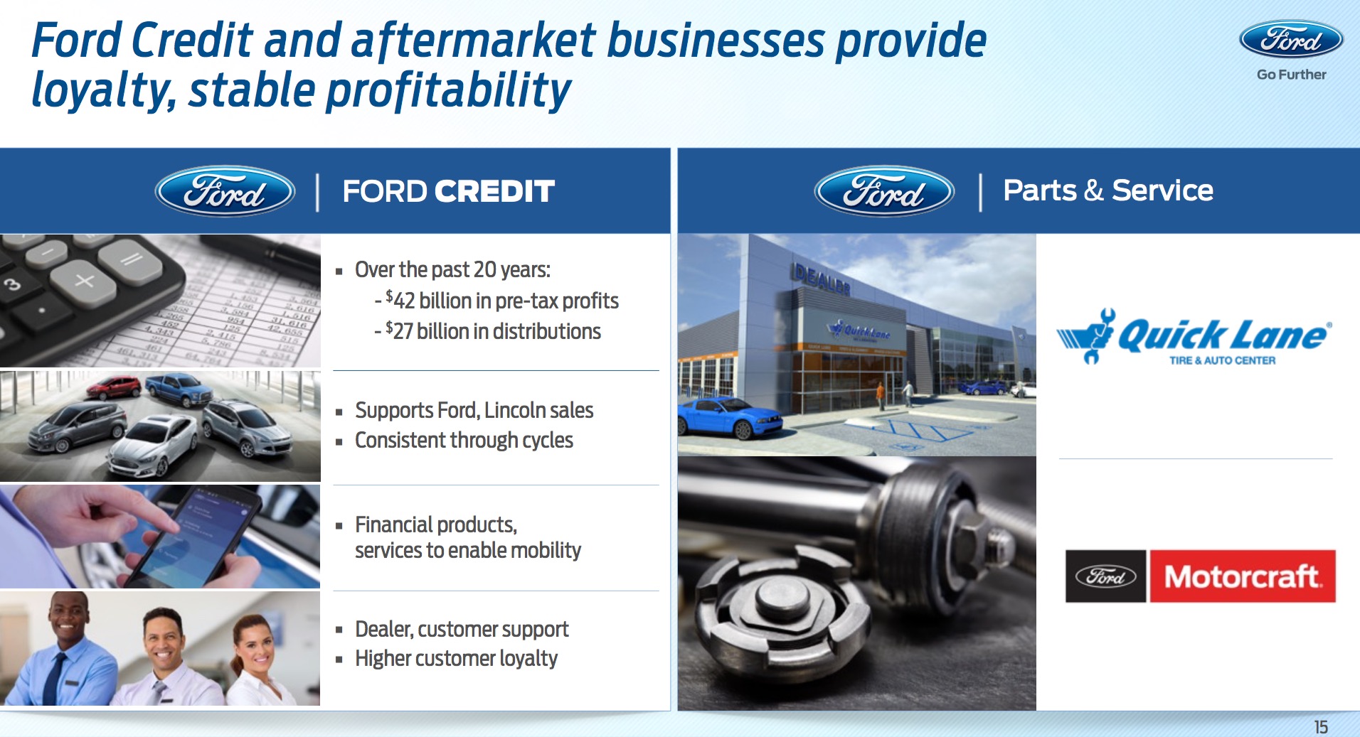 But Ford also sees its financial-services arm and its parts-and-service unit together as a profit pillar. That's less exciting than a new truck or the latest hot Mustang, but as Fields explained, these businesses are important cornerstones for Ford's future as well as its present.
