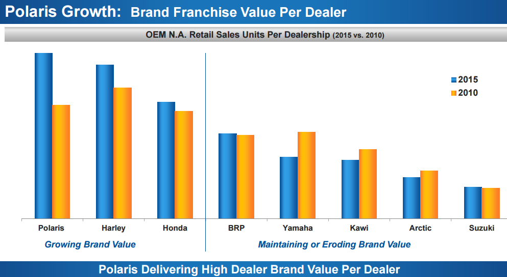 Don't get me wrong: Polaris' more expensive RZR issue is a big deal, and investors aren't happy. However, while its margins have taken a hit recently, that should be a temporary issue that will correct after the RZR issue is wrapped up and Polaris' new facilities in Alabama and South Dakota should continue to sustain higher operating margins. Thanks to Polaris' innovation with its Slingshot, and the resurgence of its Indian motorcycle brand, among other factors, the company has outgrown the competition in value per dealership over the past half-decade: