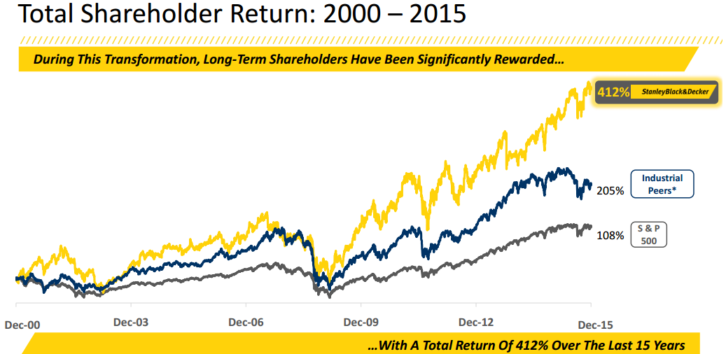 Stanley Black & Decker isn't just power tools. Consider that, last year, the company generated $4.1 billion in revenue combined from its Security and Industrial business segments in addition to the $7.1 billion from tools and storage. I'll leave you with this graph that shows Stanley Black & Decker's winning history over the past 15 years, driven partially by its consistently increasing dividend.