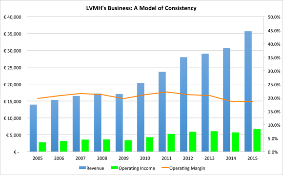 The world-renowned nature of LVMH's suite of luxury brands strongly suggests that its portfolio of companies should enjoy consistent demand into the long term, although such high-end goods experience some sensitivity to the business cycle. Here's how LVMH's profitability has behaved since 2005.