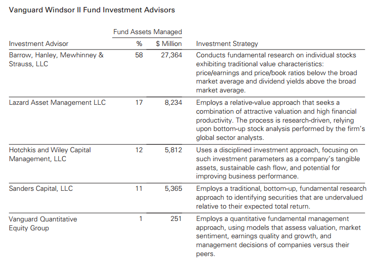 Where many of Vanguard's funds are advised by Vanguard and Wellington Management, Windsor II has quite the handful of managers running the portfolio. Note that Vanguard's team manages the smallest fraction of the fund's assets.