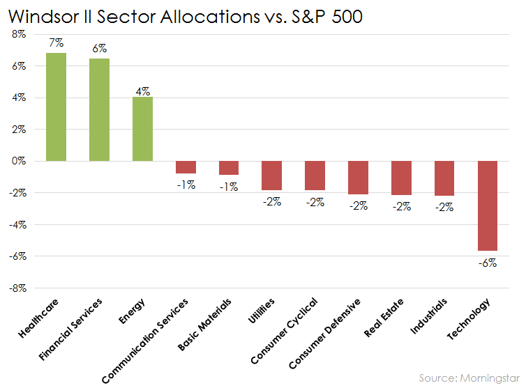 As with any active fund, Windsor II deviates from large cap indexes like the S&P 500 by sector weightings. Note that the fund has significantly more exposure to healthcare, financial services, and energy than the S&P 500. Meanwhile, it is significantly underweight in growth sectors like technology. One would naturally expect Windsor II to perform best against the market when healthcare, financials, and energy companies lead the market.