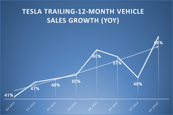 With a big third quarter behind it, Tesla isn't just growing rapidly, but it's growing at an accelerating rate. Consider Tesla's trailing-12-month year-over-year growth rates, which arguably make up the best method for assessing the automaker's growth trajectory.