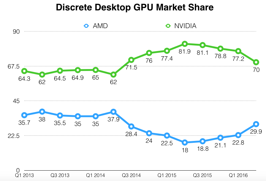 AMD managed to jump from 22.8% to 29.9% over the past two quarters, but NVIDIA is still the undisputed GPU champ with 70% of the market.