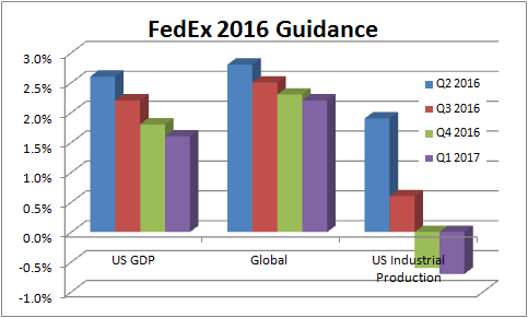 The chart below shows you how FedEx's management has adjusted its forecast for economic growth and industrial production in 2016. For reference, the first guidance shown (given at the Q2 2016 results) was given in December 2015. As you can see below, growth expectations have been reduced throughout the calendar year.