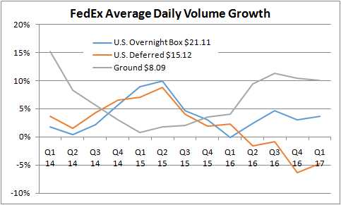 Finally, FedEx's results confirmed an interesting trend whereby growth in demand for premium services is more than growth in demand for slower, less expensive delivery options. You can see this by comparing volume growth for FedEx's U.S. overnight box service with its U.S. deferred service.