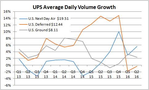 You can notice the same trend developing when comparing volume growth at UPS' U.S. next-day air service with its U.S. deferred service.
