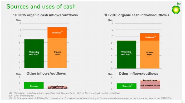 A war chest that big might have investors wondering if a major acquisition or a massive buyback could be on the horizon. Unfortunately, after drilling down into the company's liabilities and cash flow, it is evident that BP has two primary purposes for that money right now: Fund its remaining Deepwater Horizon liabilities and its dividend to shareholders.