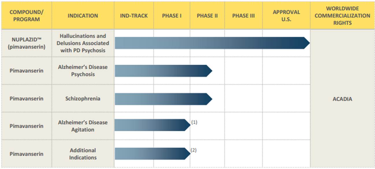 And perhaps as an added buyout trigger, Acadia is close to releasing the results of a mid-stage study assessing pimavanserin in Alzheimer's disease psychosis (ADP) -- an indication that could easily bring in another billion or so in sales. In fact, pimavanserin's overall clinical program has the potential to make it one of the top-selling drugs in the world well before it loses patent protection in the U.S. in 2028:
