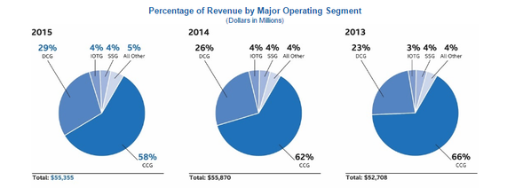 The bulk of Intel's revenue has historically come, and still comes, from the first group. In 2015, for example, Intel's client computing group (which consists primarily of personal computer chip sales) took in $32.22 billion in revenue -- approximately 58% of the company's top line for the year.