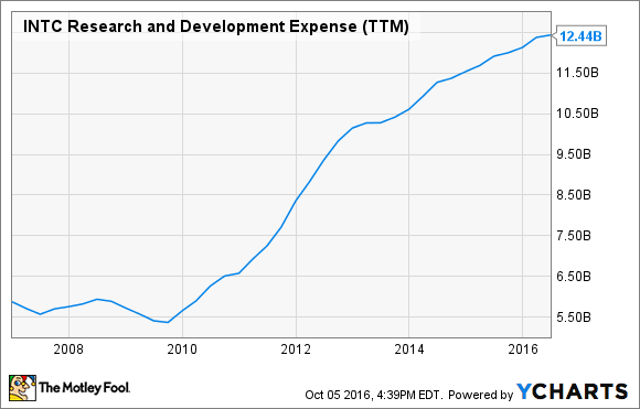 Intel has also ramped up its research and development spending quite substantially over the last five years in order to allow the company to better capitalize on new growth opportunities (though not all of them, such as smartphone/tablet platforms, have worked out) and to defend market share in its core operating segments.
