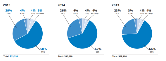 In its most recent 10-K filing, Intel provided breakdowns of its revenue by segment for 2013, 2014, and 2015, as you can see below: