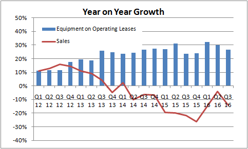 As you can see below, Deere's equipment on operating leases continues to grow even as equipment sales decline.